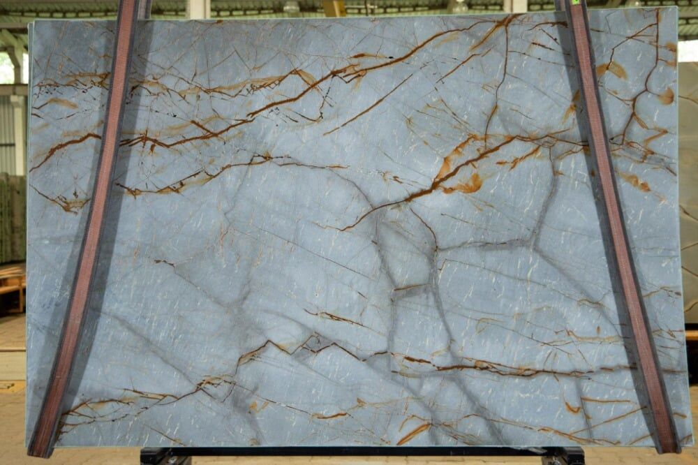 A cloudless blue sky meets the regal and dignified columns of ancient Rome is what Azul Imperiale brings to the imagination. A striking gold cuts through the mellow blue background, giving this Brazilian quartzite depth and beauty. Azul Imperiale creates a soft and light atmosphere, making it perfect for bathrooms and exterior environments.
